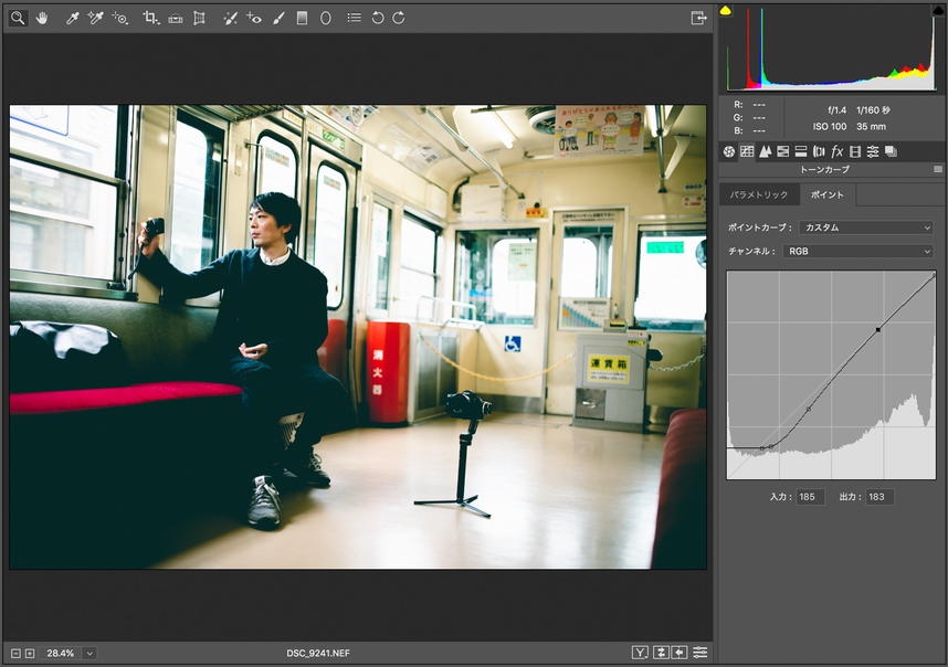 - 【重要】トーンカーブを図のように調整(=黒すぎるシャドウをグレー寄りにしてレンジを狭める)