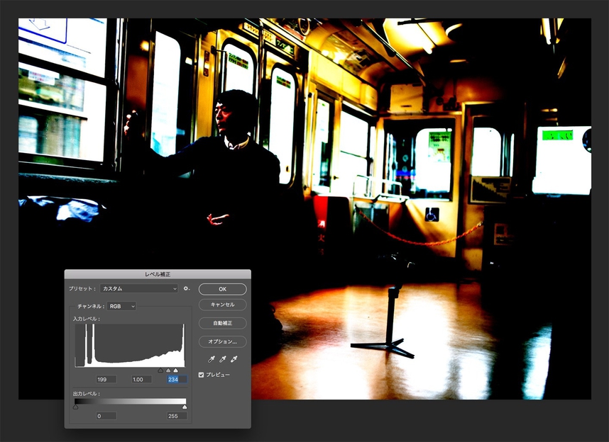 背景だけの状態なはずなので、背景レイヤーを複製して図のようにレベル調整。