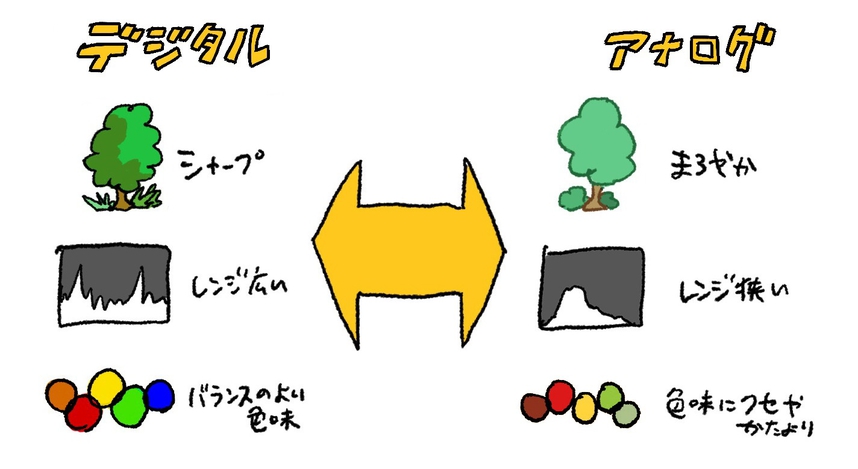 - デジタルよりもレンジが狭い(デジタルは暗いところから明るいところまで写るが、アナログは写る範囲・幅が狭い)