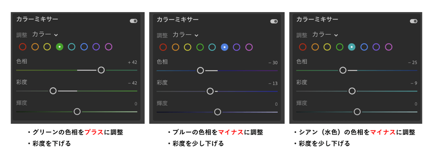 その際は同じくカラーミキサーでの調整で赤やオレンジの彩度を下げたりする必要があります。