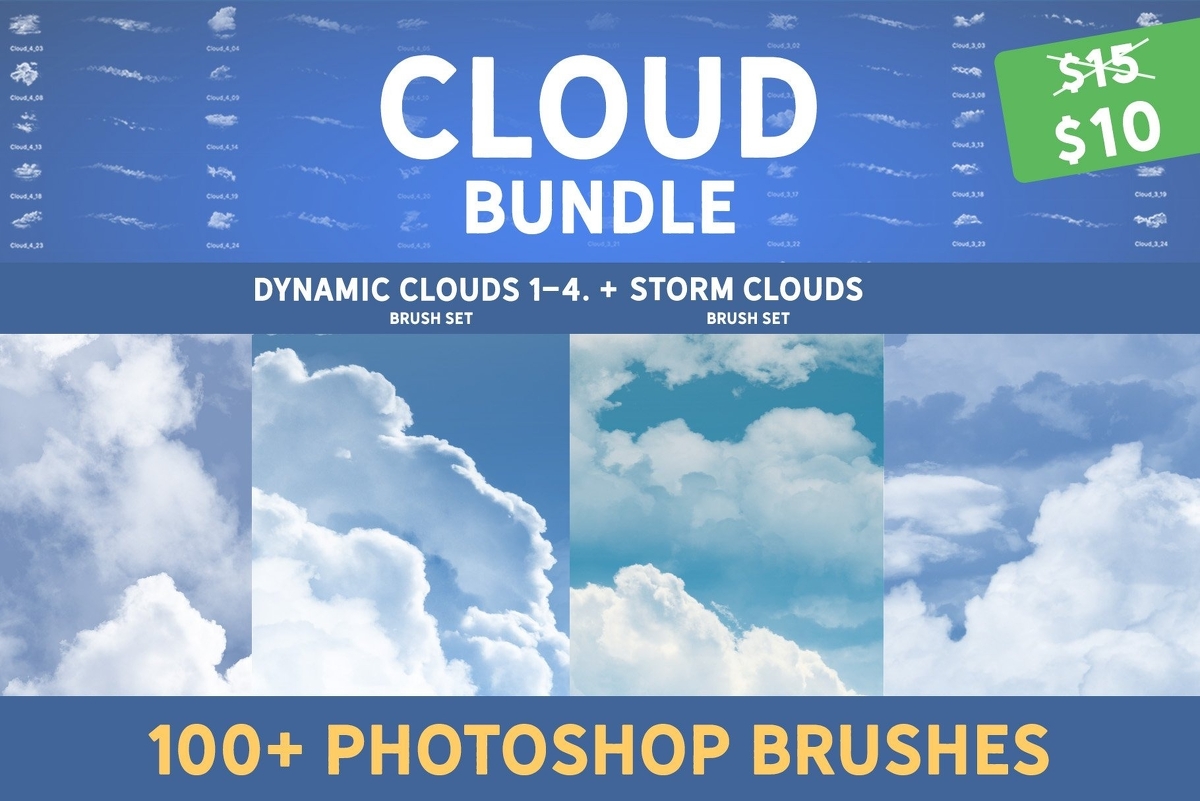 『Dynamic clouds brush set 1〜4』と『Storm Clouds brush set』がすべてバンドルされたお得な雲ブラシセット。