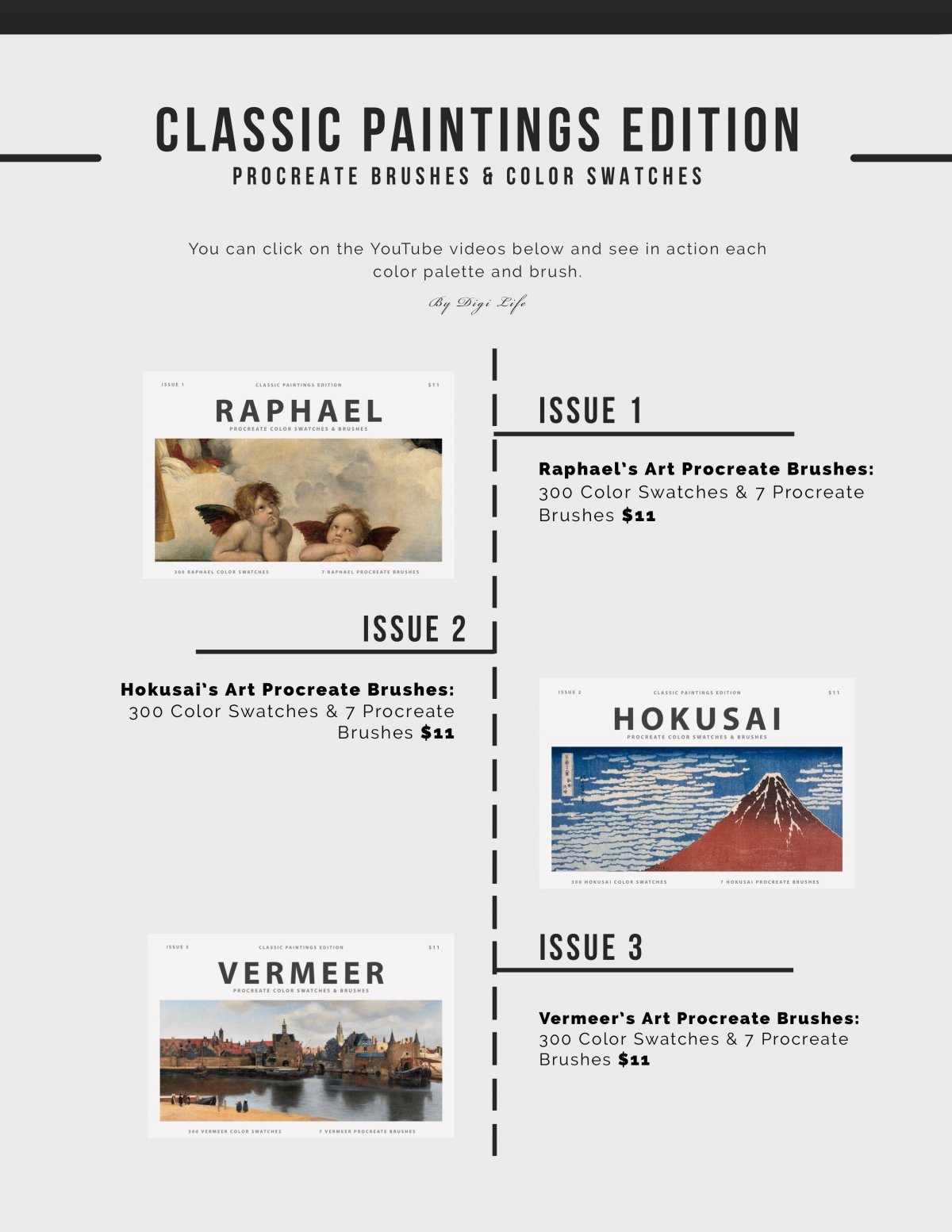 『Hokusai's Art Procreate Brushes』や『Van Gogh's Art Procreate Brushes』など、それぞれの芸術家をフィーチャーしたブラシセットをはじめ多種多様なブラシセットがそれぞれ11〜15ドルで販売されていますが、それらがすべて1パックになっています。