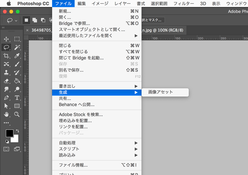 メニューから、ファイル > 生成 > 画像アセット のチェックを入れるだけです。