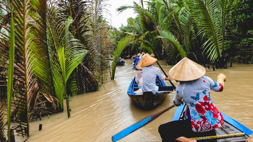 ホーチミンからツアーのバスでメコン川へ行き、ボートに乗ったり、食事をしたり、歌を聴いたり、夜にはホタルを見たりします。見所がたくさんあってかなり楽しめます。