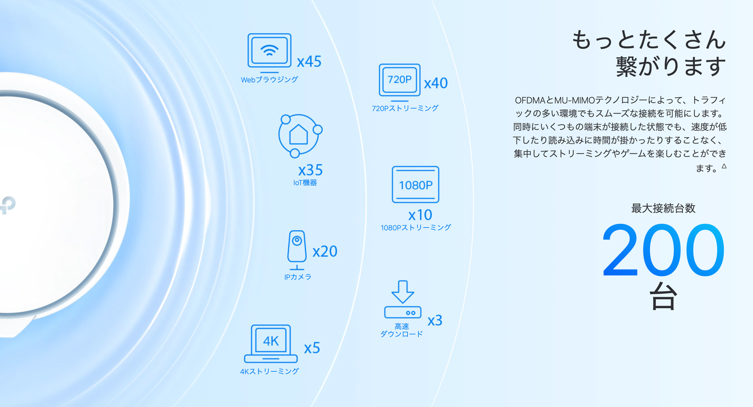 もっとたくさん繋がる:パフォーマンスを低下させることなく、最大200台までのデバイスが接続可能です。