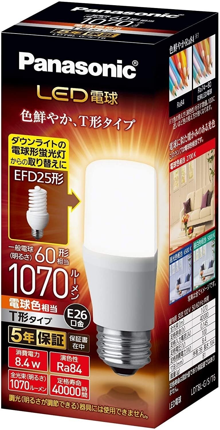 パナソニック LED電球 口金直径26mm 電球60W形相当 電球色相当(8.4W) 一般電球・T形タイプ 密閉器具対応 LDT8LGST6
