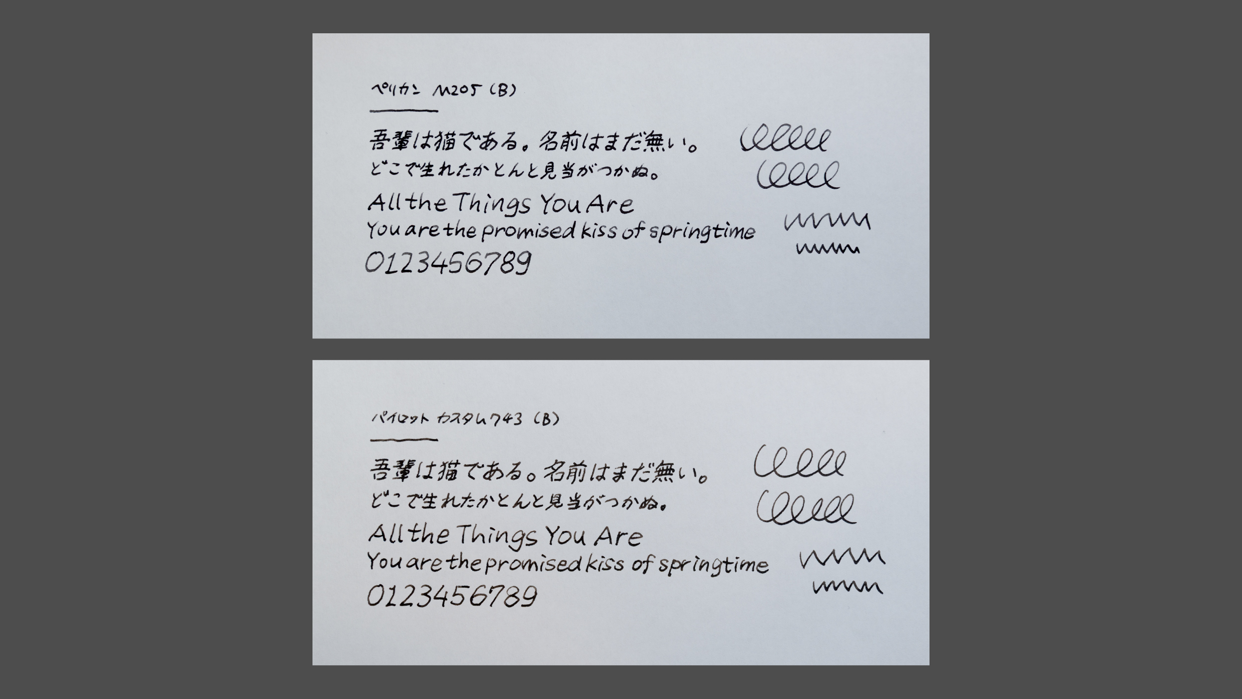 国産メーカーのパイロットのカスタム743(B)と比較してみると、わずかにM205の方が太いかも、くらいの微差。