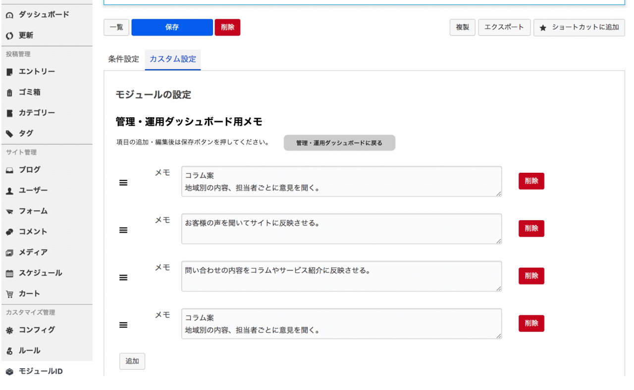 管理ページ > カスタマイズ管理・モジュールID > 作ったモジュールの『設定』 > カスタム設定