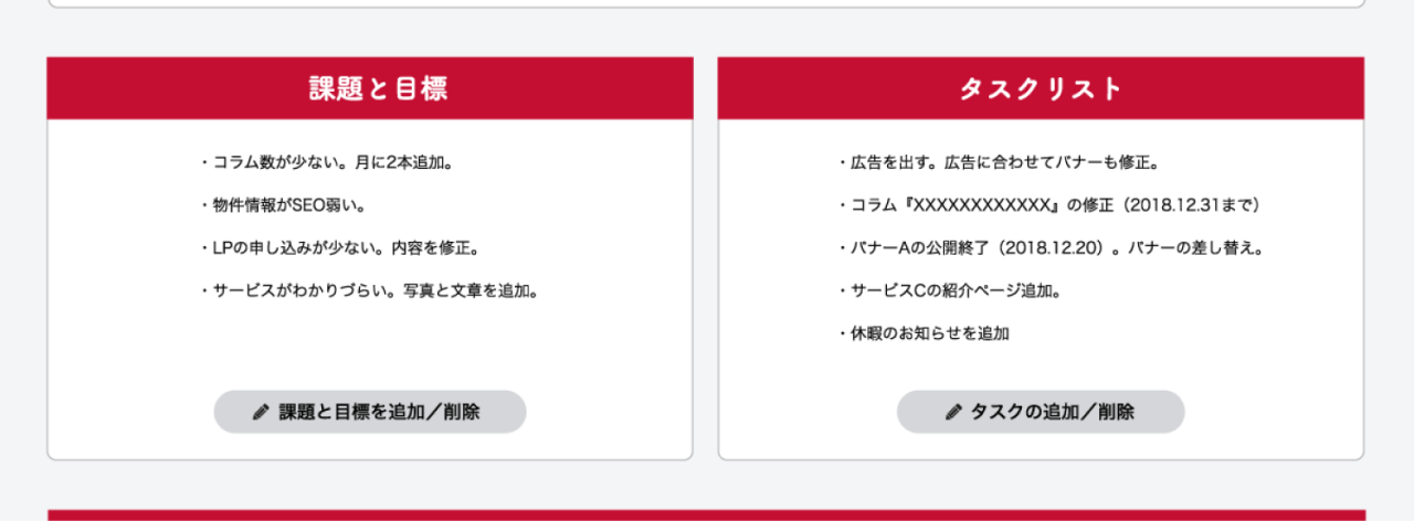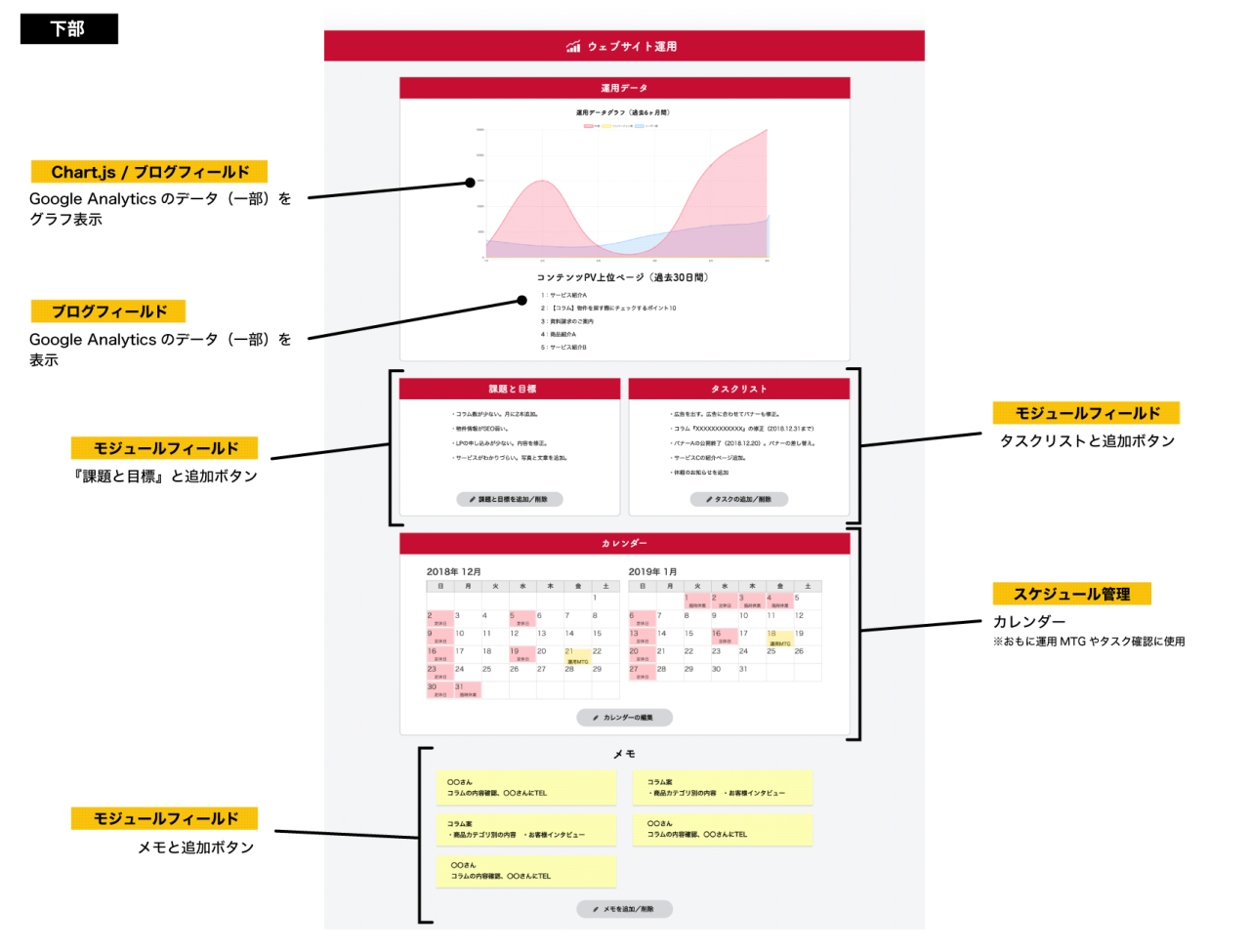 - 運用を補助する『タスク』と『課題・目標』『メモ』を配置