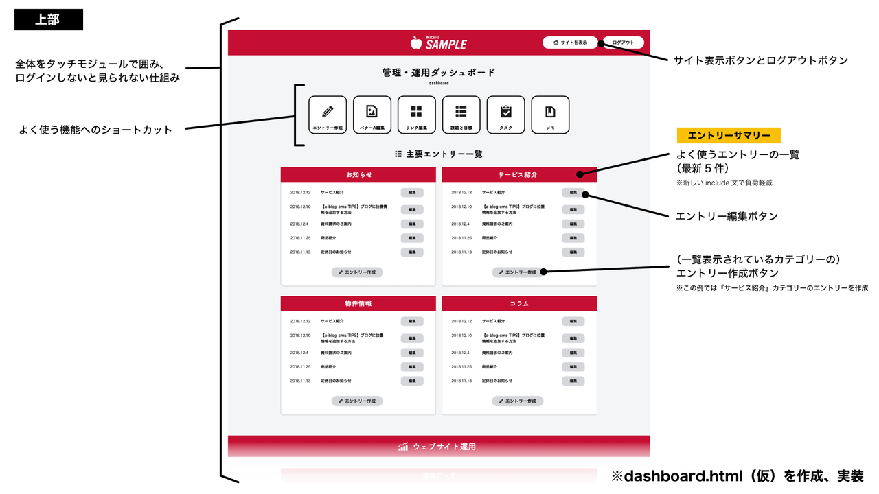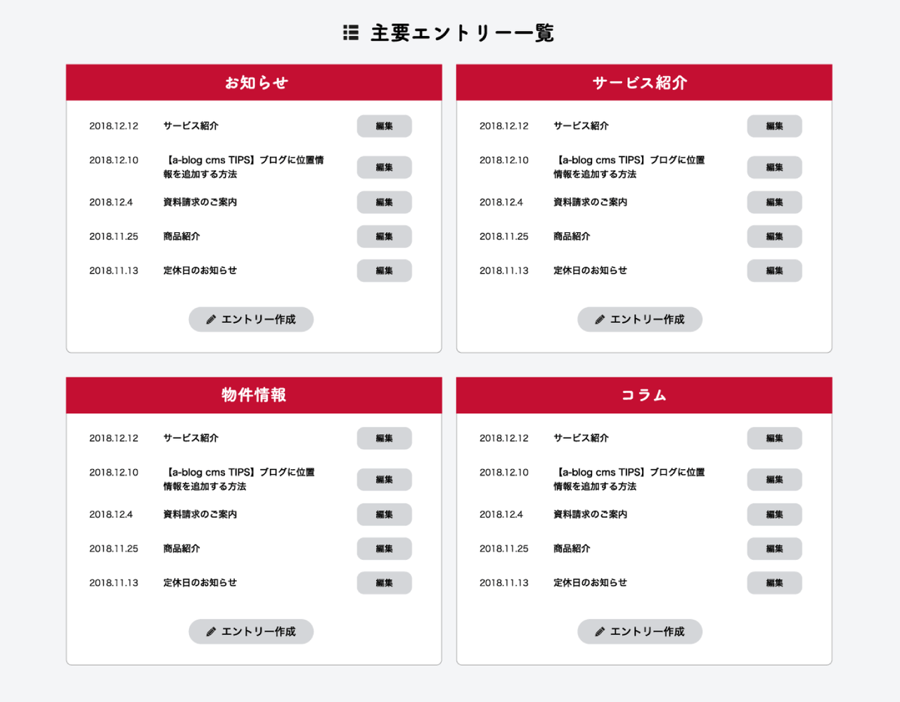 - エントリー一覧(エントリーサマリー)とエントリー編集ボタン・作成ボタン(そのカテゴリの作成に飛ぶ)を一緒に配置