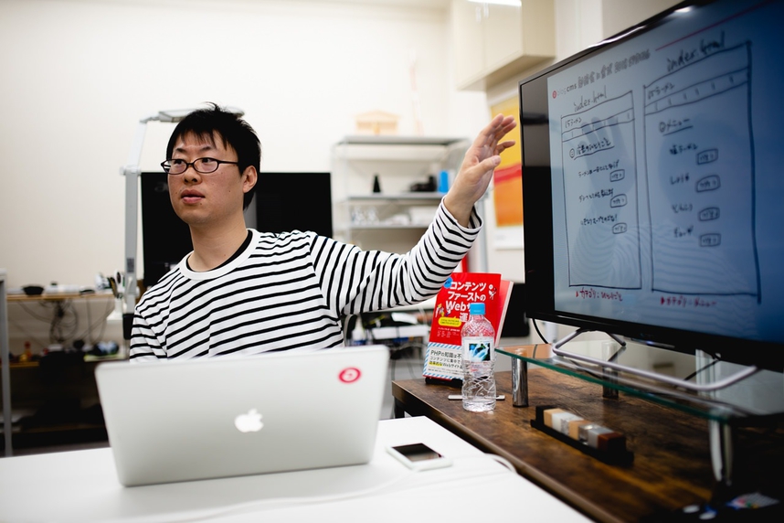 まずは僕からユーザーセッションをスタート。a-blog cmsの基礎知識(エントリー・カテゴリー・テーマ・モジュール・その他)について解説しました。